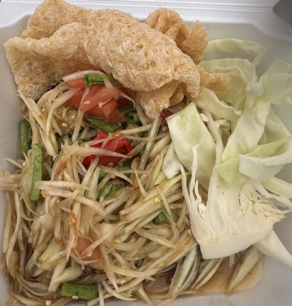 We also serve Taiyaki fish-shaped waffles with both sweet and savory fillings including Red Bean, Nutella, Pepperoni & Cheese, and Mozzarella Cheese. Our handmade Dim Sum Shu Mai are filled with a shrimp and pork blend and steamed fresh. Adding a bold and refreshing contrast to the menu, we offer Lao-style papaya salad, a vibrant dish made with shredded green papaya, lime, chili, and fermented flavors that bring a perfect balance of spicy, sour, and savory.